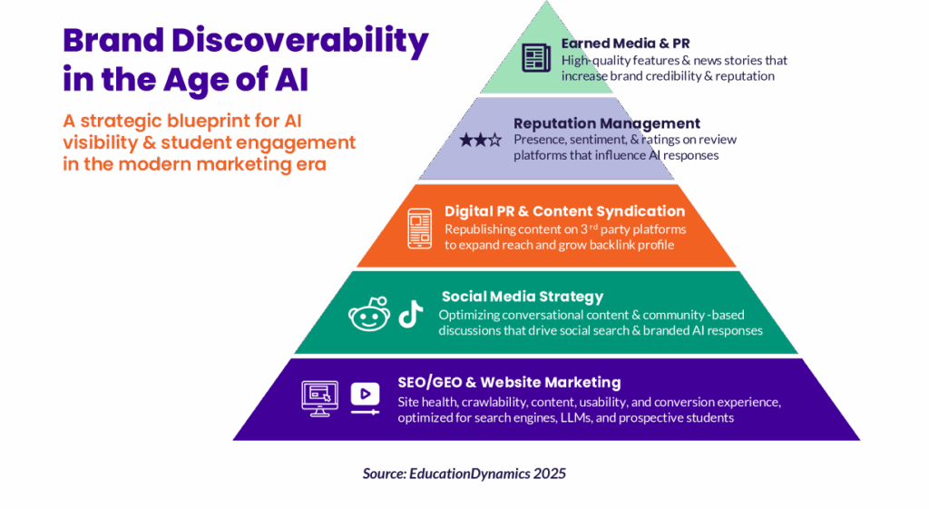 This shift makes it clear: reputation, trust and visibility now shape the top of the enrollment funnel more than any single program. Institutions that invest in brand equity, AI-ready SEO and consistent messaging across channels are the ones that show up first when learners start their search.