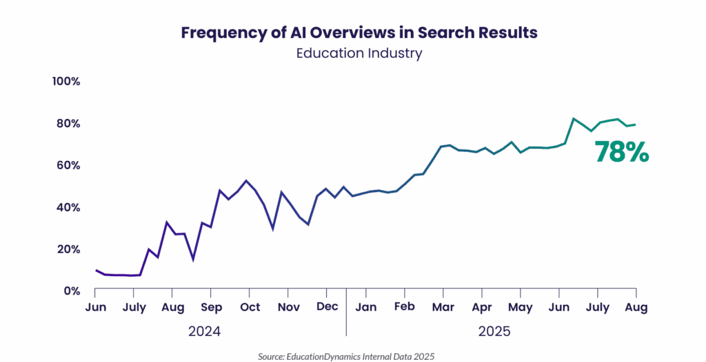 An estimated 78% of education-related searches now return an AI Overview, and nearly 45% of Google searches end without a click. Students are building shortlists and making decisions from AI overviews, chatbots, social feeds and video long before your institution’s website loads. If your brand isn’t present in these AI-driven answers, you’ve lost the conversation before you see the prospect.