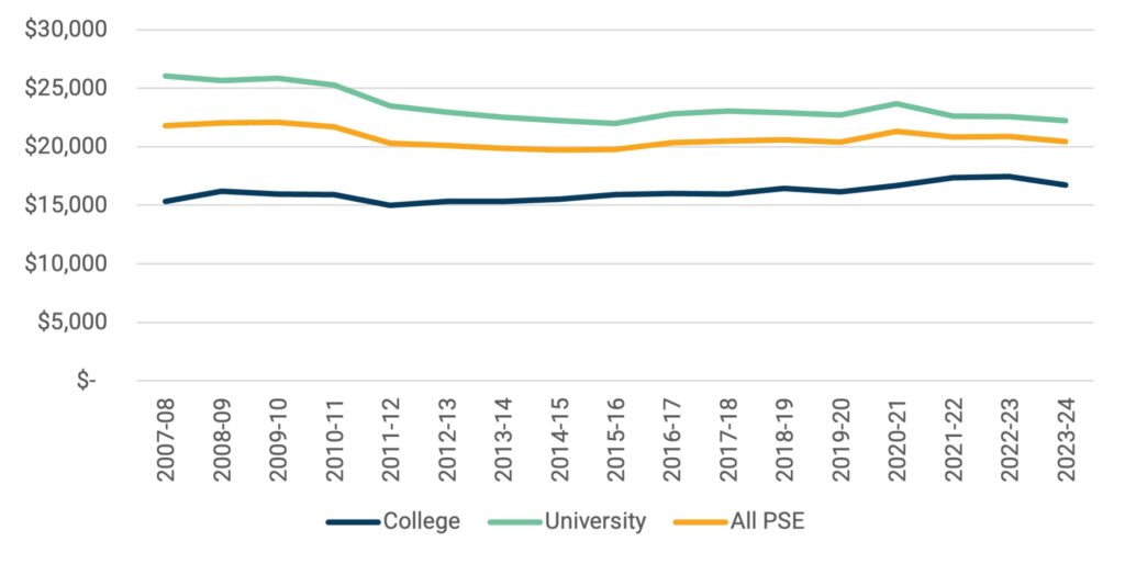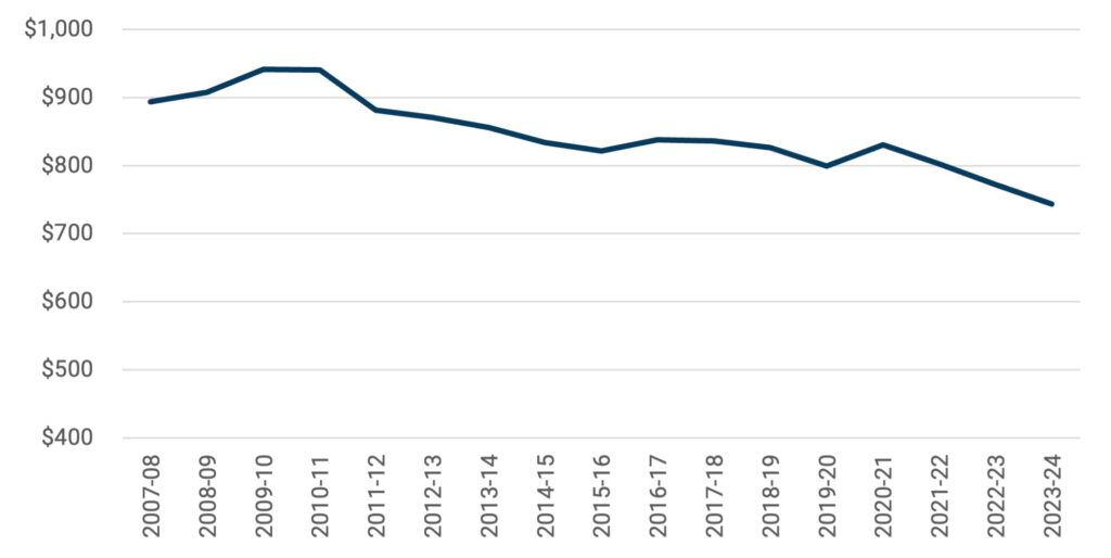 Figure 4: Public Spending on Post-Secondary Education Institutions Per Inhabitant, in $2023, 2007-08 to 2023-24