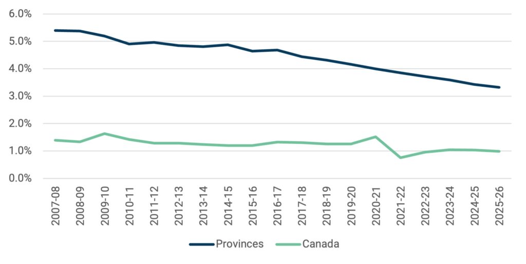 We can also look at these figures in per-inhabitant terms. There was a point in the late 00s where Canada had about 33 million inhabitants and public sources spent $30 billion per year on postsecondary education. Fifteen years and seven million new inhabitants later, we’re still spending $30 billion per year. That results in a 21% reduction in spending on universities and colleges per inhabitant from public sources, as shown in Figure 4. In Figure 5, we look at postsecondary spending as a percentage of government budgets. Again, we see a case of spending on postsecondary institutions falling consistently because overall government expenditure is rising quickly. In the past fifteen years, aggregate provincial spending on postsecondary has fallen as a percentage of total provincial expenditures from 5.4% to just 3.3%; for federal spending it has fallen from 1.6% to just 1%.
