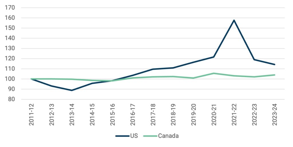 Figure 6: Indexed Real Public Spending on Postsecondary Institutions, Canada vs. US, 2011-12 to 2023-24 (2011-12 = 100)