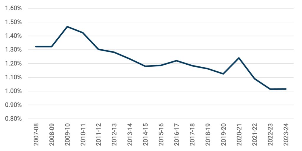 Figure 3: Public Spending on Postsecondary Education as a Percentage of GDP, in $2023, 2007-08 to 2023-24