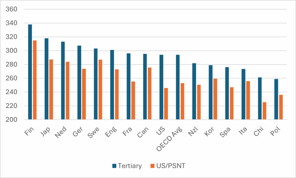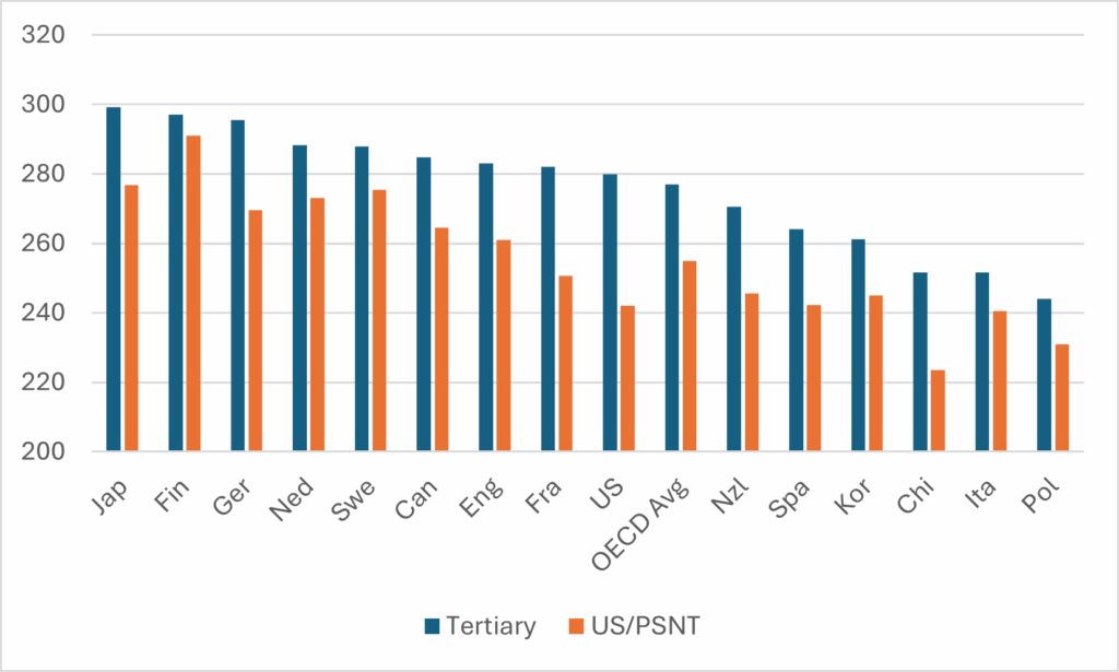 Three weeks ago, the Organization for Economic Co-operation and Development (OECD) released its annual stat fest, Education at a Glance (see last week’s blog for more on this year’s higher education and financing data). The most interesting thing about this edition is that the OECD chose to release some new data from the recent Programme for International Assessment of Adult Competencies (PIAAC) relating to literacy and numeracy levels that were included in the PIAAC 2013 release (see also here), but not in the December 2024 release.
