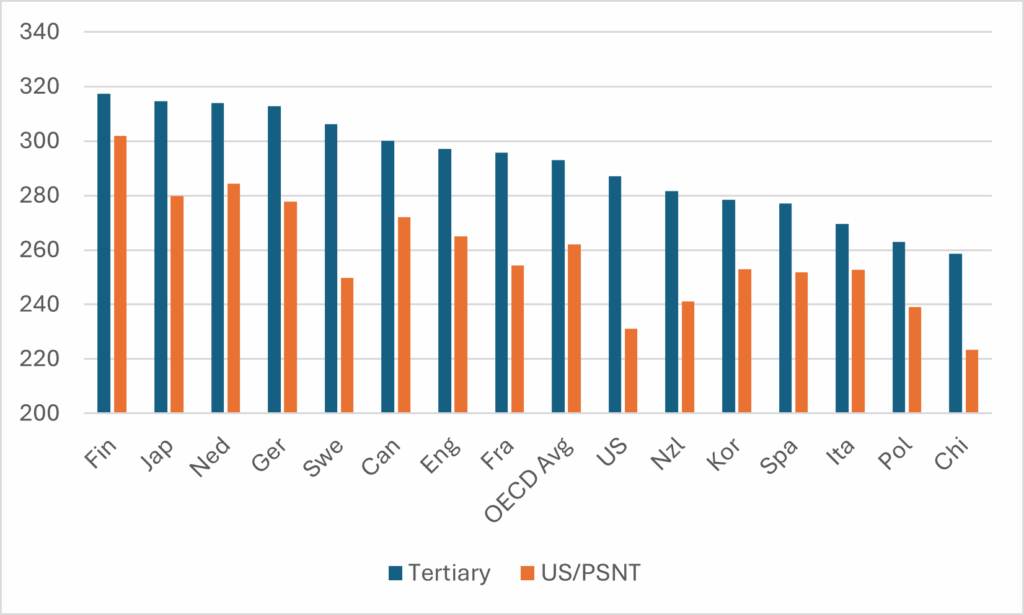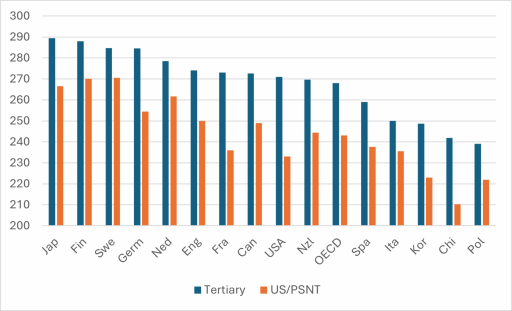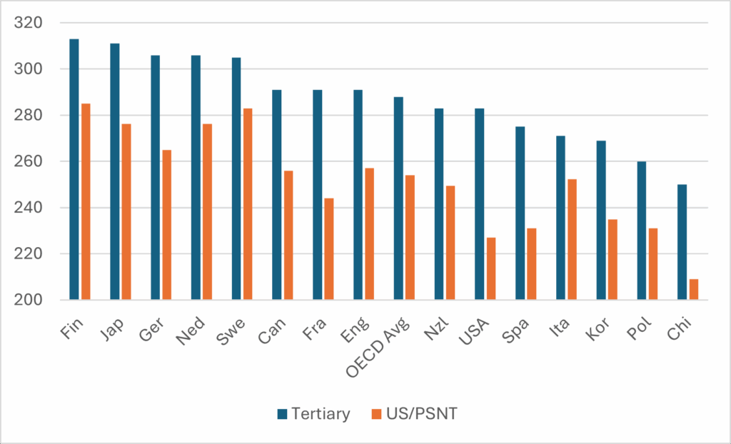 Figure 5: PIAAC Average Numeracy Scores by Highest Level of Education Attained, Population Aged 25-34, Selected OECD Countries