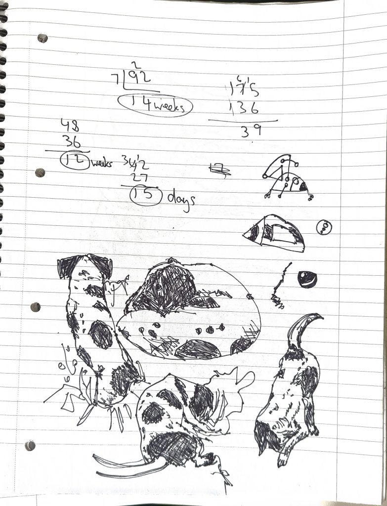 Consumption is easier than production. Yay I’ve heard that before so I just reproduced it here. I want to sketch everyday. I don’t. I enjoy it but I don’t. The last time I did was, again, two years ago (AI has ruined me!!!). I did some observations of my mum’s dog; Benji. Thanks Benji. Good dog. I still divide and multiply as if I was 8 years old. I also like to doodle like if Klee and Kandinsky adopted me.
