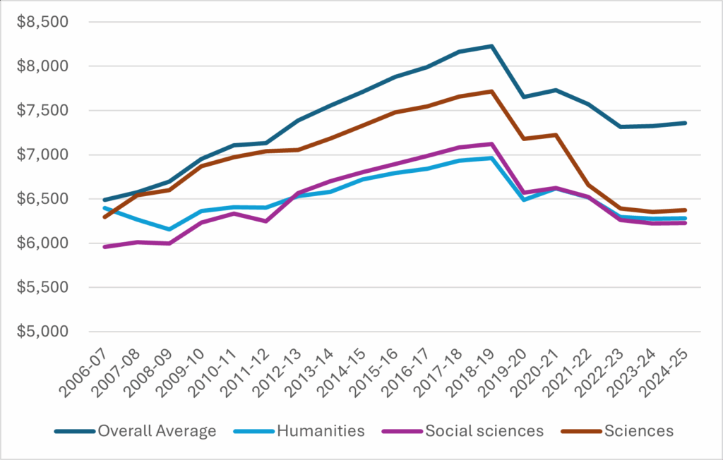 But then, just for fun, I decided to look at tuition at the level of individual fields of study. And what I found was kind of interesting. Take a look at Figure 2, which shows average tuition in what you might call the university’s three “core” areas: social science, humanities, and physical/life sciences. It’s quite a different story. The pre-2018 rise was never as pronounced as it was for tuition overall, and the drop in tuition post-2018 was more pronounced. As a result, tuition in the humanities is about even with where it was in 2006 and in the sciences is now three percent lower than it was in 2006.