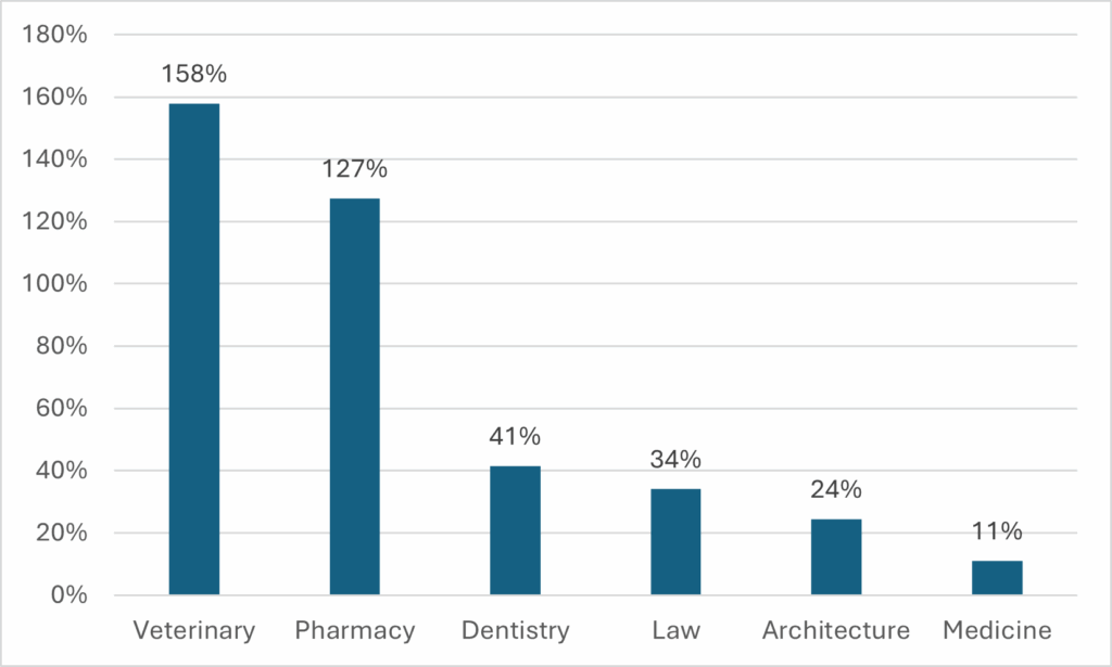 Two very different pictures, right? Quite clearly, second-entry degrees – which are a tiny fraction of overall enrolments – are nevertheless dragging the overall average up quite a bit. Unfortunately, it’s not easy to work out exactly how much because – inexplicably – Statscan does not use the same field of study boundaries for enrolment and tuition. But, near as I can figure out, there are about 15,000 students in law in Canada, 5,000 in pharmacy, 3,000 in dentistry and 2,000 in veterinary science. So that’s 25,000 students (or 2% of the undergraduate total) in fields with very high tuition increases, and a little back-of-the-envelope math suggests that these increases for just 2% of the student body were responsible for about 15% of all tuition growth.