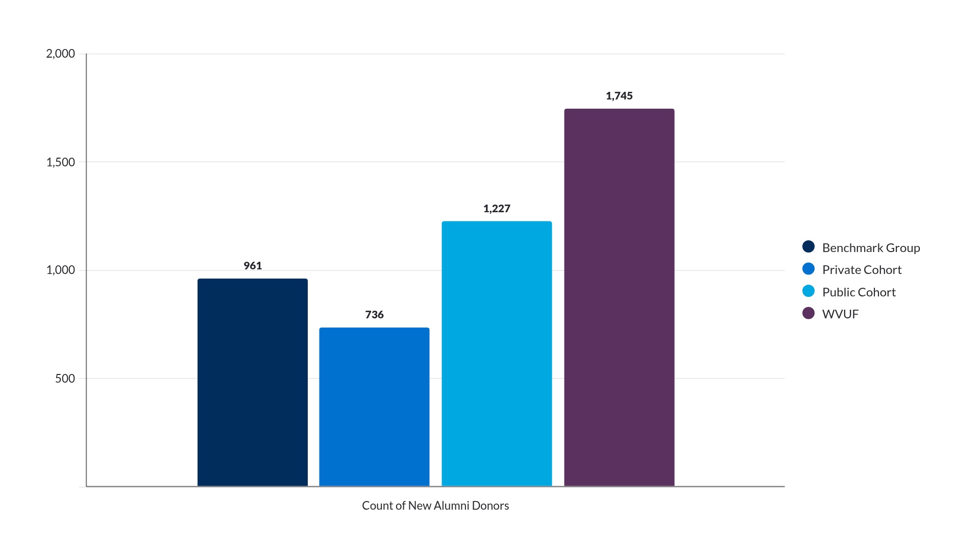 WVUF’s count of 1,745 new alumni donors last fiscal year was well ahead of the benchmark group and the Foundation also received first-time gifts from an impressive count of more than 5,000 family and friends.