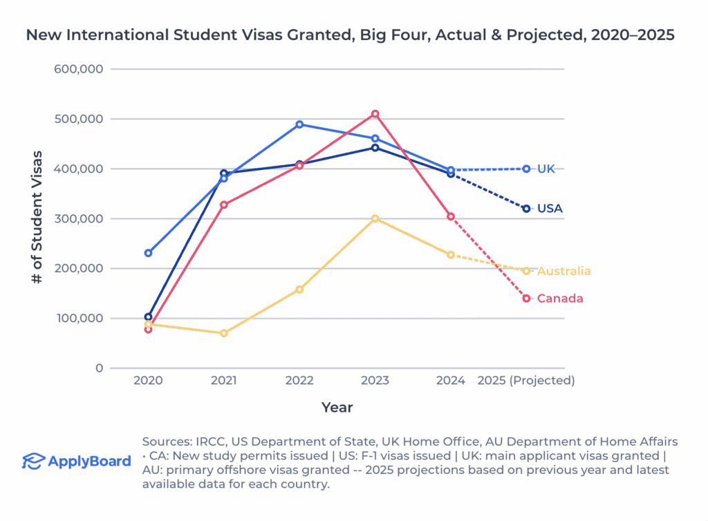 As per ApplyBoard estimates, Canada will see the sharpest drop in new international students, granting just 80,000 postsecondary study visas this year, while the US and Australia are set to see less dramatic drops.