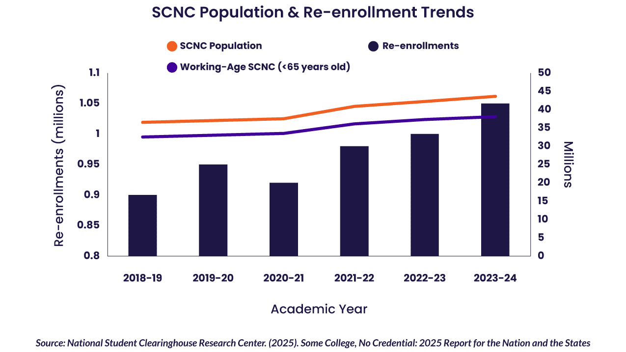 Convert the 43 million with some college, no credentials into completers through credit recovery, tailored pathways and adult-first design.