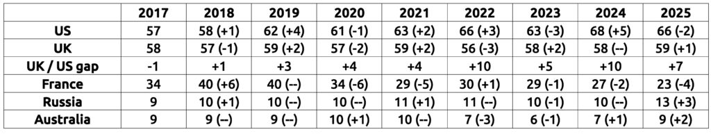 The results for the leading two countries, the US and the UK, are broadly comparable to those for recent years but other countries, like France and Germany, fare worse than in past years while Russia and India have improved their position.