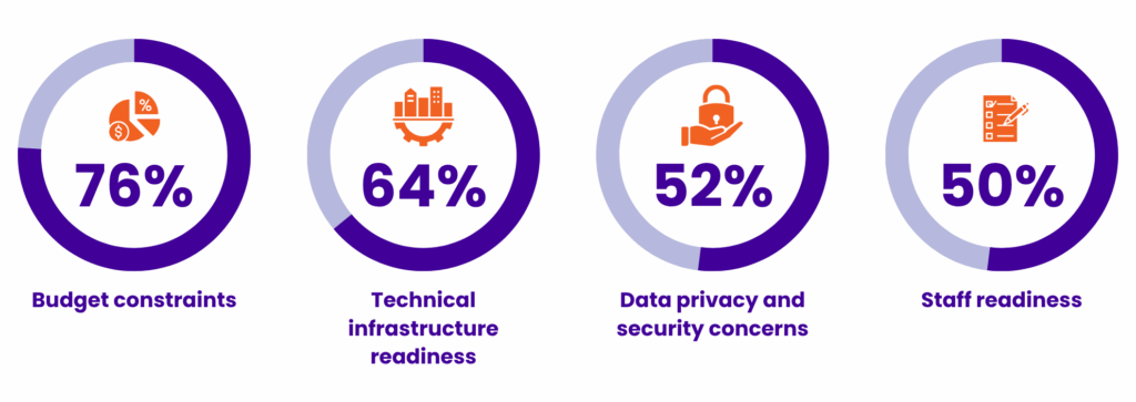 Despite the growing enthusiasm and proven benefits, institutions continue to face significant barriers to full AI integration. The top challenges cited by respondents include: