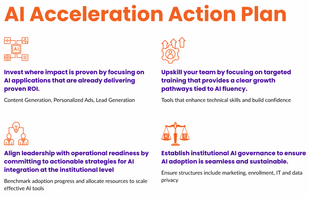 The study identified key areas where AI is delivering the strongest return on investment (ROI) including customized ad messaging, lead generation and creative content development. Content optimization also stood out, with 36% of respondents noting a “very high” or “high” ROI. If nearly 70% see efficiency gains and almost half see a positive impact on enrollment, why aren’t more institutions fully embracing this?