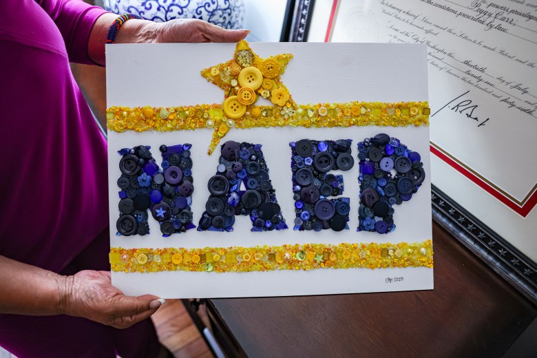 Peggy Carr holds artwork made by a former colleague at the National Center for Education Statistics. NAEP stands for the National Assessment of Educational Progress, which Carr helped build into the influential barometer of how American students are faring. Credit: Valerie Plesch for The Hechinger Report
