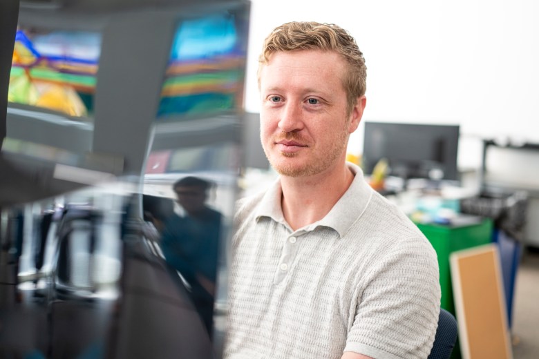 Jake Mohin, director of solution engineering at a company that uses AI to predict how chemicals will synthesize, uses a co-working space at InnovatePGH in Pittsburgh’s Innovation District. Credit: Nancy Andrews for The Hechinger Report