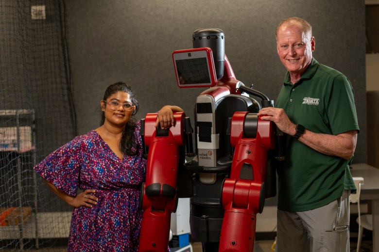 Dave Mawhinney, founding executive director of the Swartz Center for Entrepreneurship at Carnegie Mellon University, with Saisri Akondi, an international graduate and co-founder of the startup D.Sole. “There still is a part of the population that asks, ‘What are you doing here?’ ” says Akondi. Credit: Nancy Andrews for The Hechinger Report