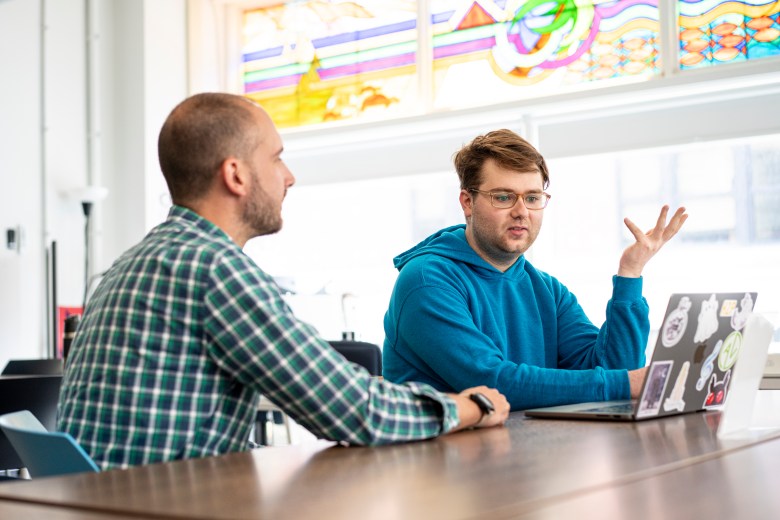 Mike Madden, left, vice president of InnovatePGH and director of the Pittsburgh Innovation District, talks with University of Pittsburgh graduate student Jayden Serenari in one of InnovatePGH’s co-working spaces. Credit: Nancy Andrews for The Hechinger Report