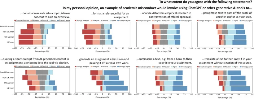 Discrepancies by gender and domicile status go beyond patterns of use and trust, extending to how students interpret institutional guidance on generative AI. Most UK universities now publish policies outlining acceptable and unacceptable uses of GAI in relation to assessment and academic integrity, and typically present these rules as applying uniformly to all students. In practice, as evidenced by our study, students interpret these guidelines differently. UK-domiciled students, especially women, tend to adopt more cautious readings, sometimes treating permitted uses, such as using GAI for initial research or topic overviews, as potential misconduct. International students, by contrast, are more likely to express permissive or uncertain views, even in relation to practices that are more clearly prohibited. Shared rules do not guarantee shared understanding, especially if guidance is ambiguous or unevenly communicated. GAI is evolving faster than University policy, so addressing this unevenness in understanding is an urgent challenge for higher education.