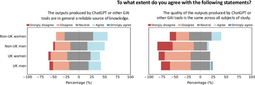At first glance, the widespread use of GAI among students might be taken as a sign of growing confidence in these tools. Yet, when students are asked about their perceptions on the reliability of GAI outputs, many express disagreement when asked if GAI could be considered a reliable source of knowledge. This apparent contradiction raises the question of why are students still using tools they do not fully trust? The answer lies in the convenience of GAI. Students are not necessarily using GAI because they believe it is accurate. They are using it because it is fast, accessible and can help them get started or work more efficiently. Our study suggests that perceived usefulness may be outweighing the students’ scepticism towards the reliability of outputs, as this scepticism does not seem to be slowing adoption. Nearly all student groups surveyed reported that they expect to continue using generative AI in the future, indicating that low levels of trust are unlikely to deter ongoing or increased use.